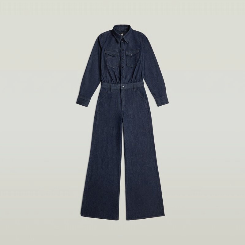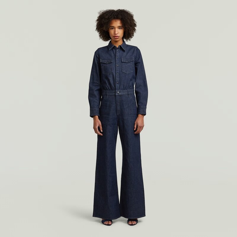 The Western Wide Leg Jumpsuit features a loose fit with a high waist and long sleeves, complemented by a classic shirt collar.