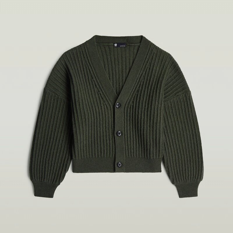 This loose cardigan knit features a button closure and a ribbed texture, offering a relaxed and versatile style.