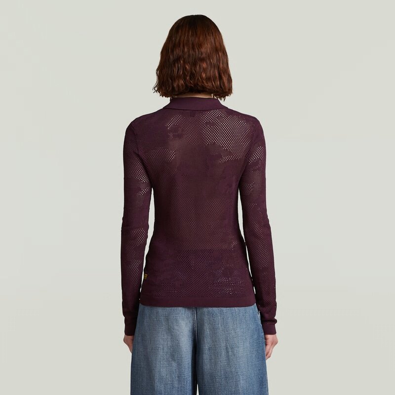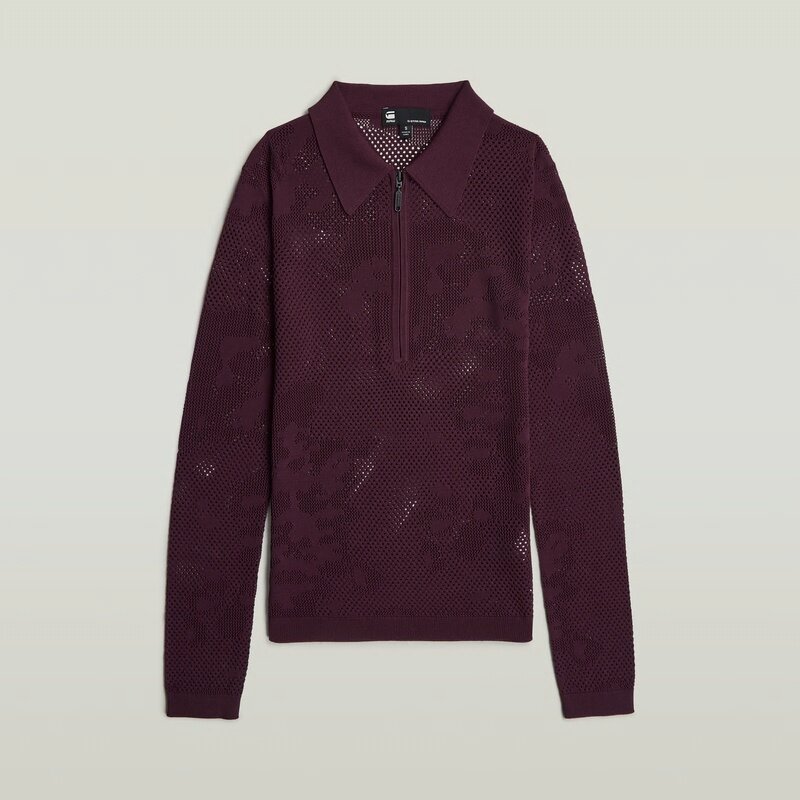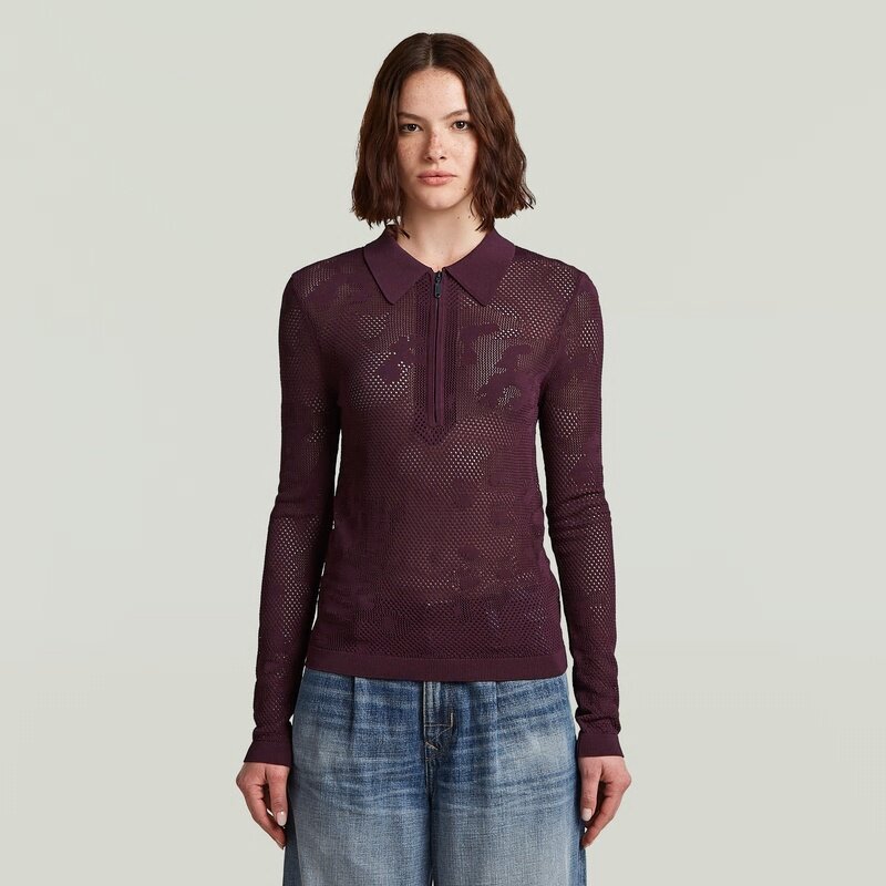 The Pointelle Slim Polo Knit features a sleek slim fit with a zip closure, offering a modern twist to classic knitwear.