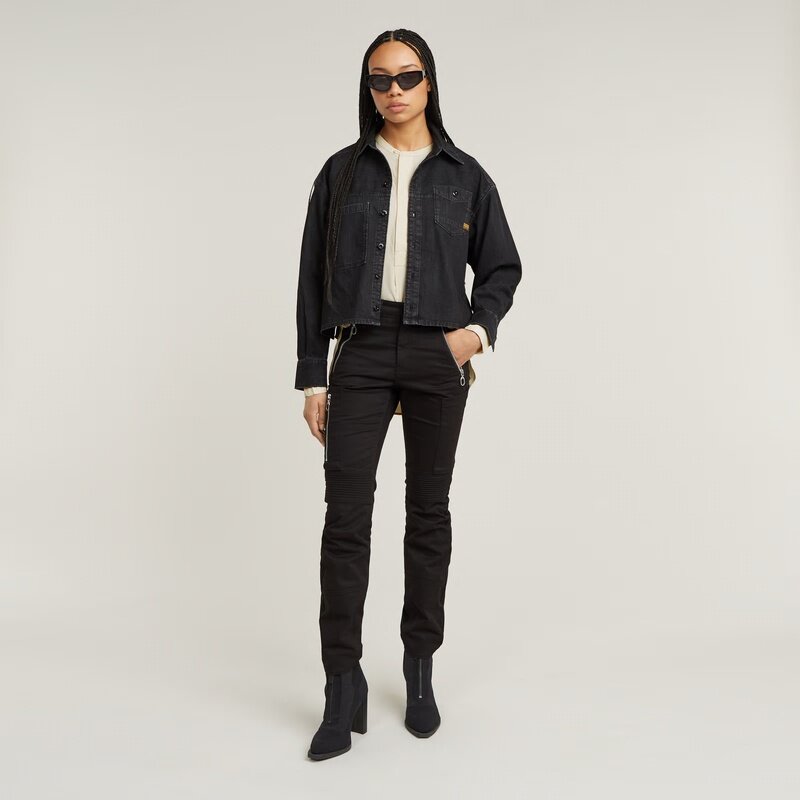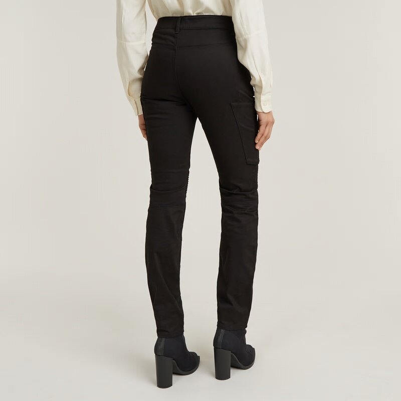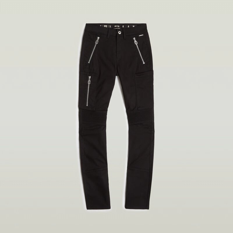 These Biker cargo pants are cut in a skinny fit and offer an ultra-high waist. Zippers are added to the waist pockets. Also one of the thigh pockets is finished with a zipper closure. The 3D structure above the knee adds character.