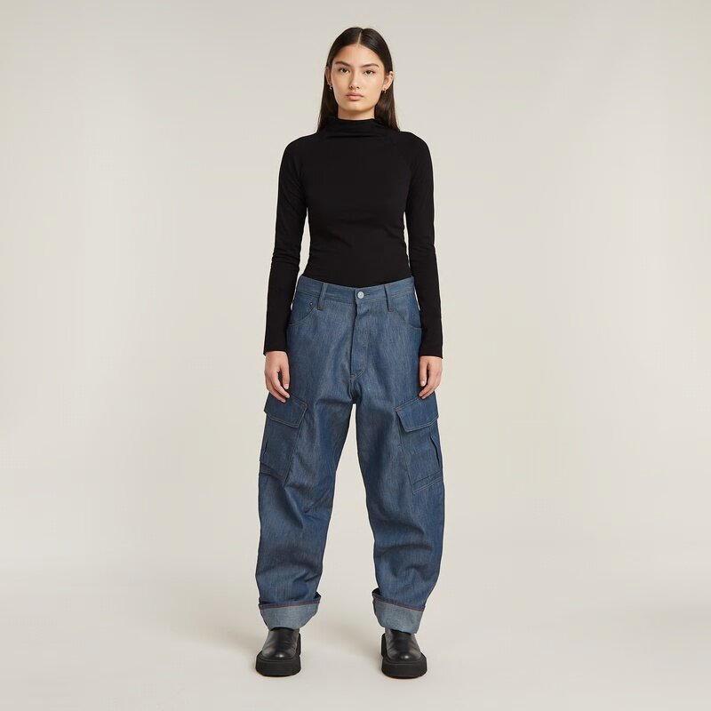 Cargo pants 3D are designed in a boyfriend fit and offer multiple pockets. A coin pocket is repositioned at the inside of the waist, while the flap pockets at the thigh partly overlap the back pockets. These cargo pants offer a button fly.