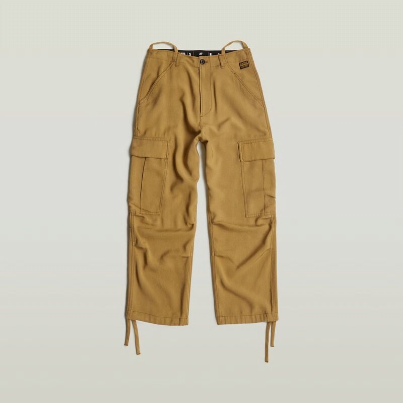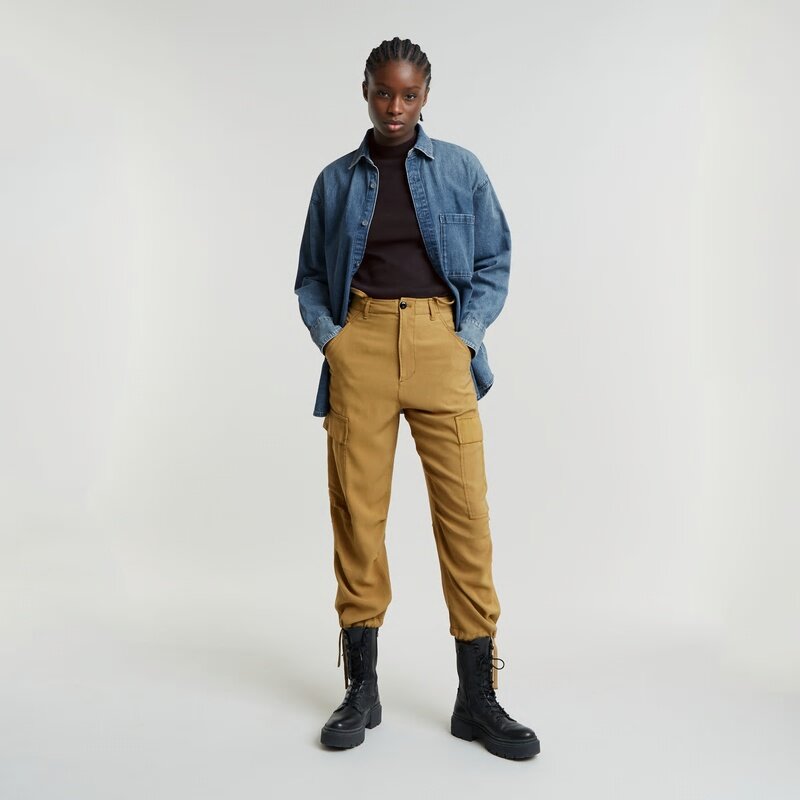 Cargo pants Drawcord offer a loose fit and are a bit shorter in length. The pleats at both sides add shape and volume. Additional volume can be created at the ankles, by tightening the inside drawcord. Woven loops at the top of the waist add detail.