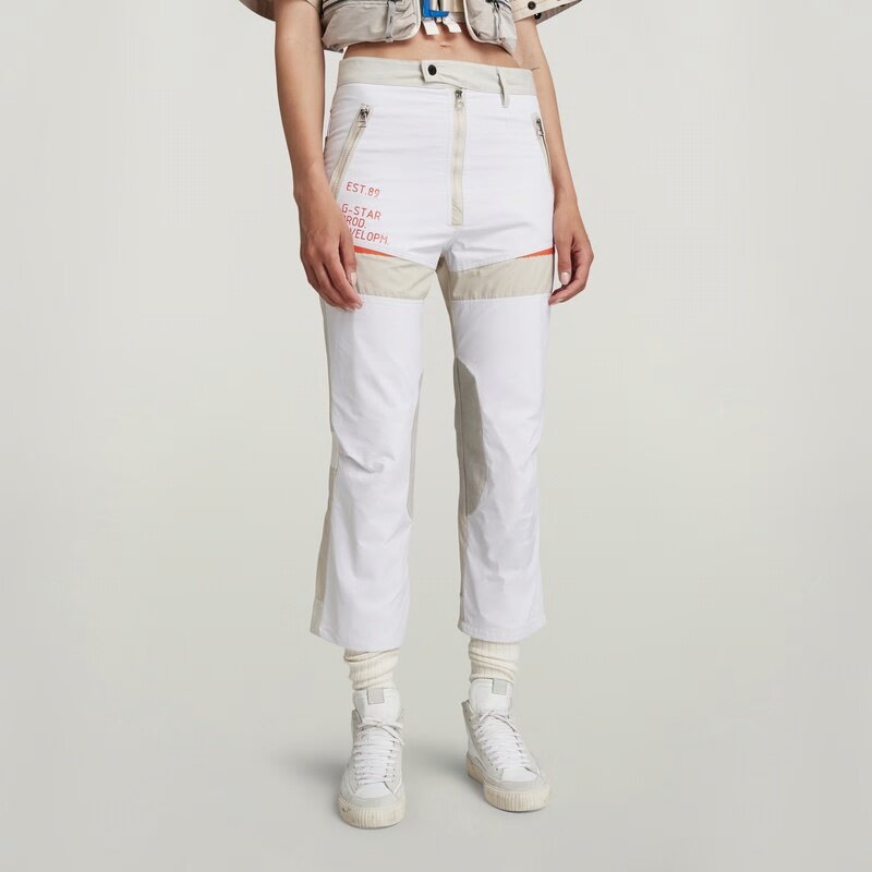 Cropped pants Desert offers a paneled design with a double layered front section. The pleats at the outer leg add shape. These pants offer a visible zipper front closure with a snap button at the top. The waist pockets also have a zipper closure. Graphic prints are placed across this cropped style to add additional detail.