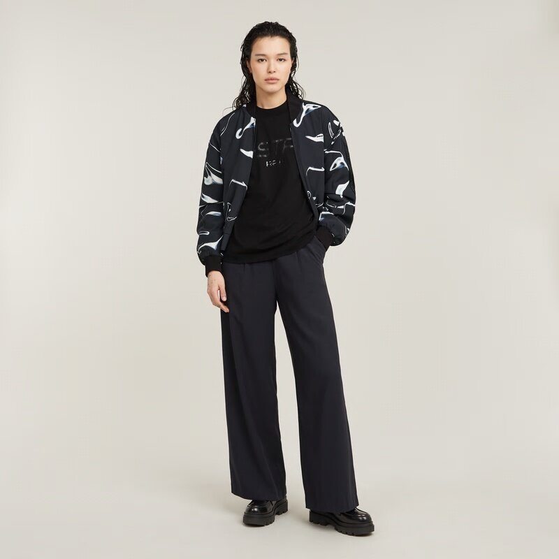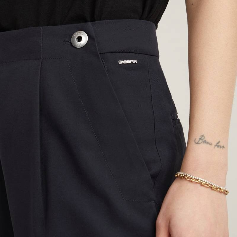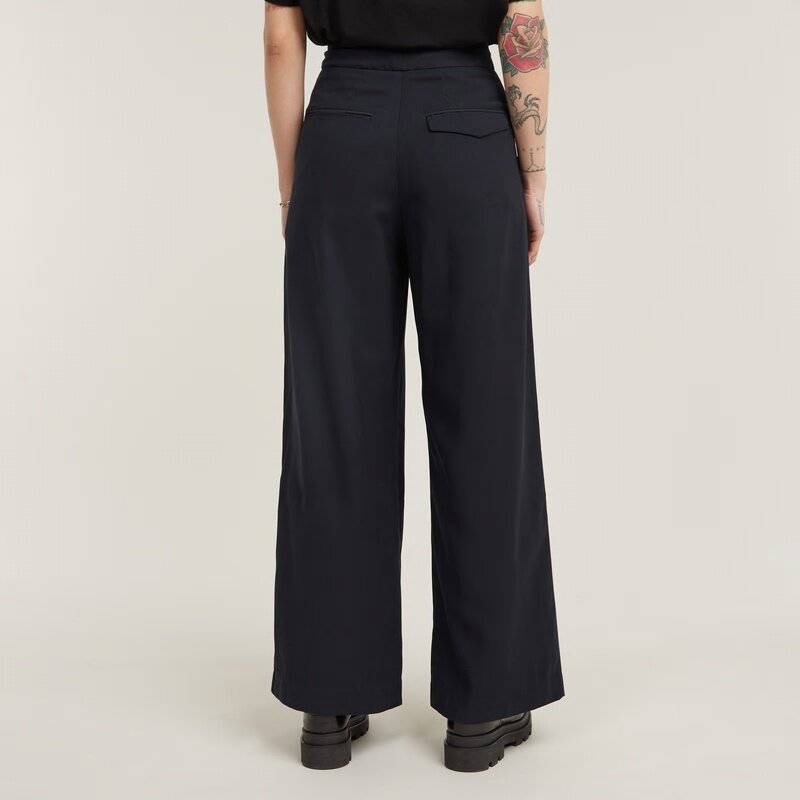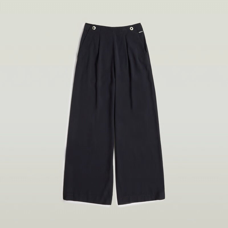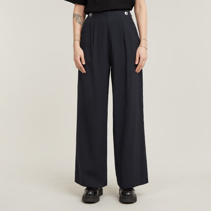 These Holiday pants offer a wide fit from the hip down. The front panel is closed with buttons at both sides. Underneath this panel, a pocket is hidden. The pleats at the front add to the loose fit. One of the back pockets shows a flap.
