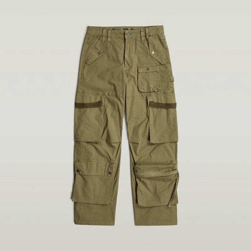 Flap pockets at the waist, snap button closure, mini cargo pocket underneath