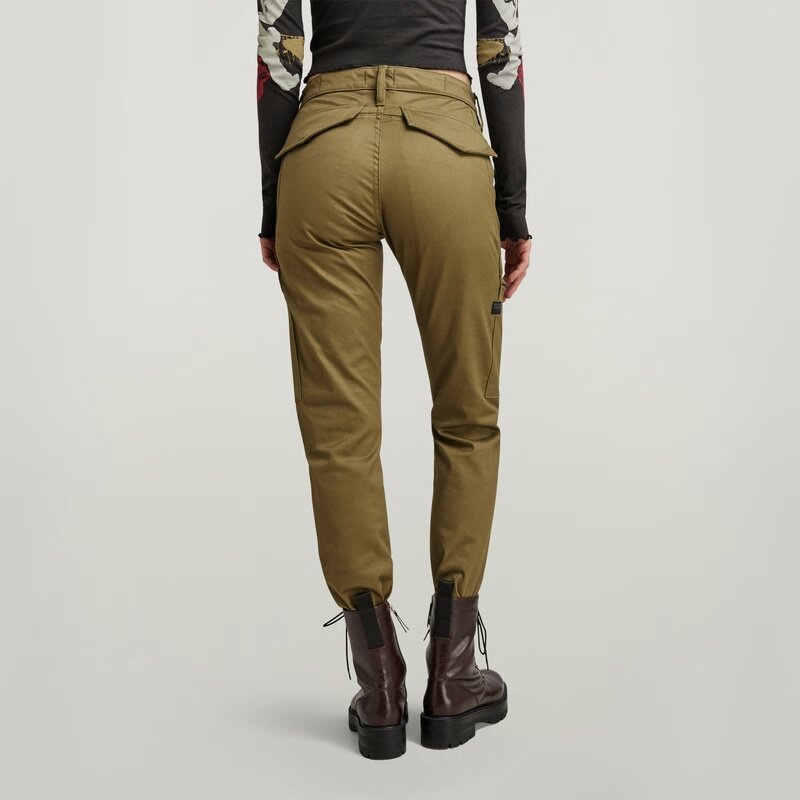 These slim fit cargo pants show thigh pockets with a concealed zipper closure. The inset pockets as well as the flap pockets at the back offer a concealed snap button. Additional seams at the upper back add to the slim fit silhouette.