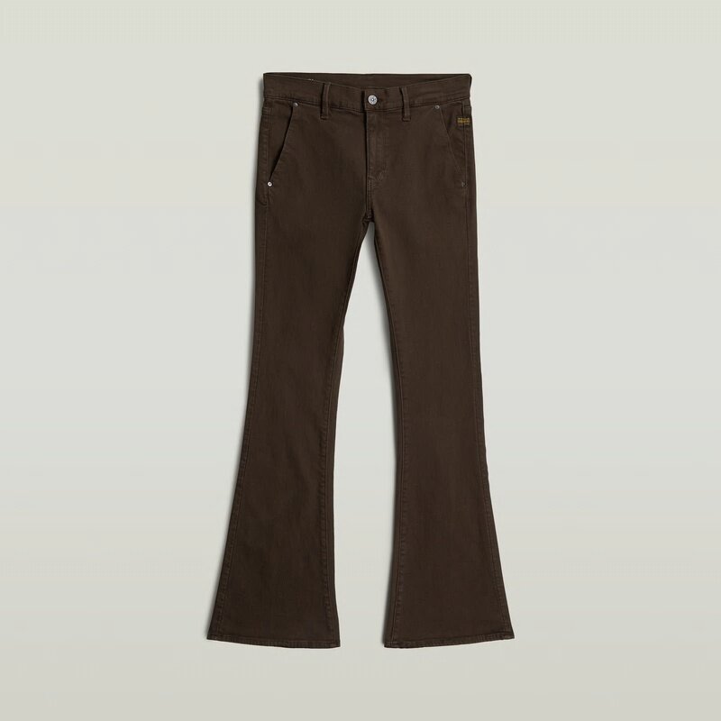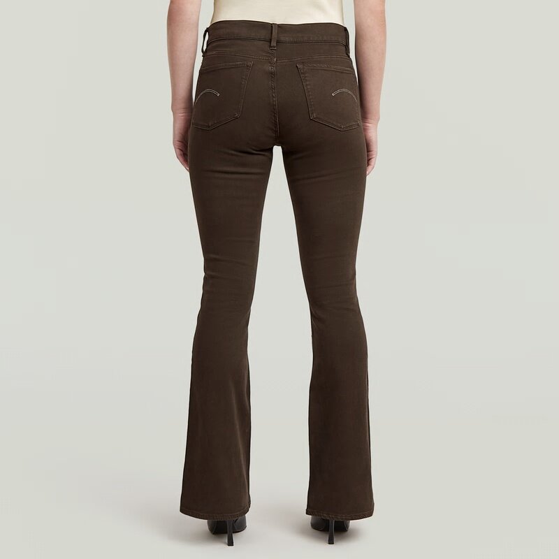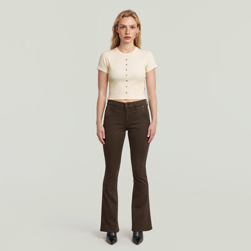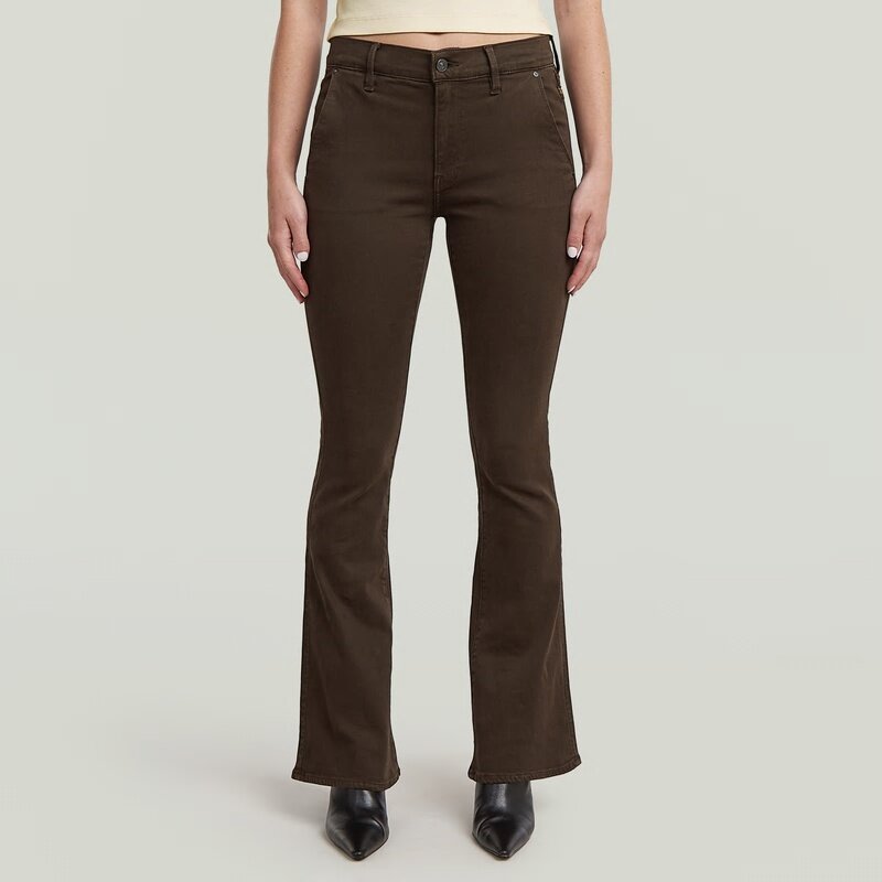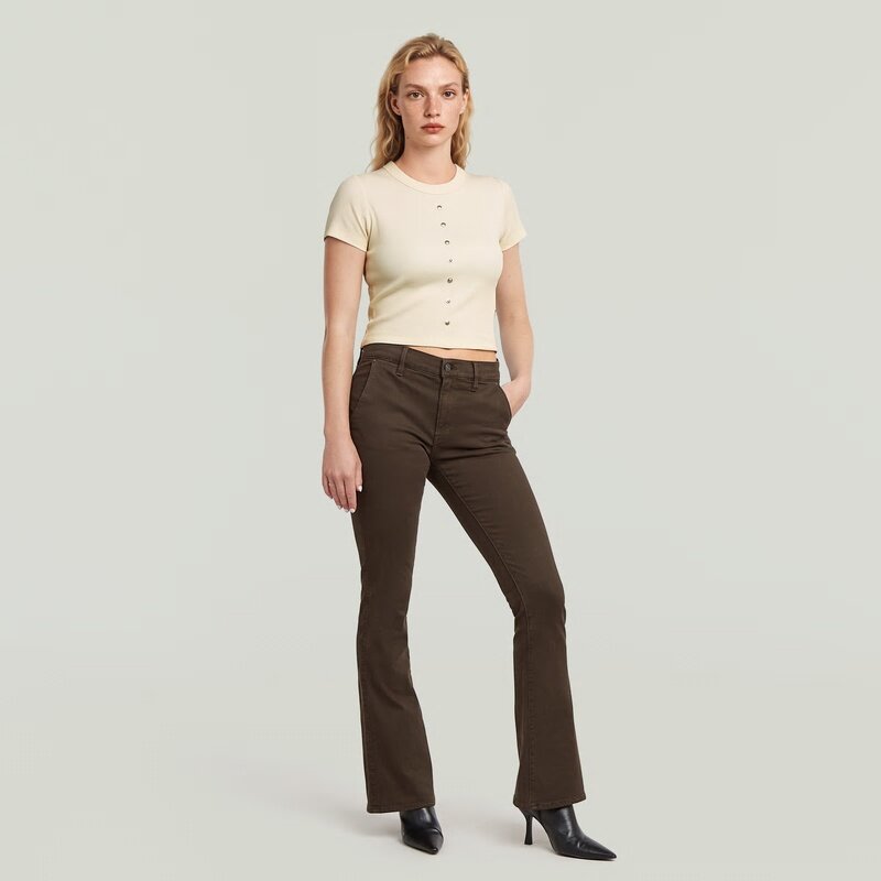 The 3301 Flare Chino offers a classic bootcut fit with a mid waist and long length. Featuring a button and zip closure for a secure fit.