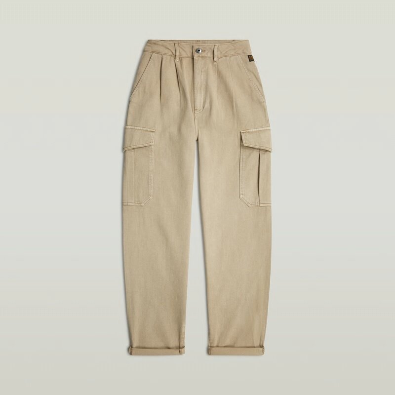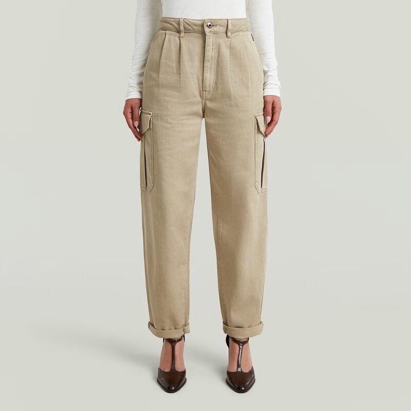 Pleated Tapered Cargo Chino offers a high waist and tapered fit, perfect for a sleek look. The zip and button closure ensures a secure fit.