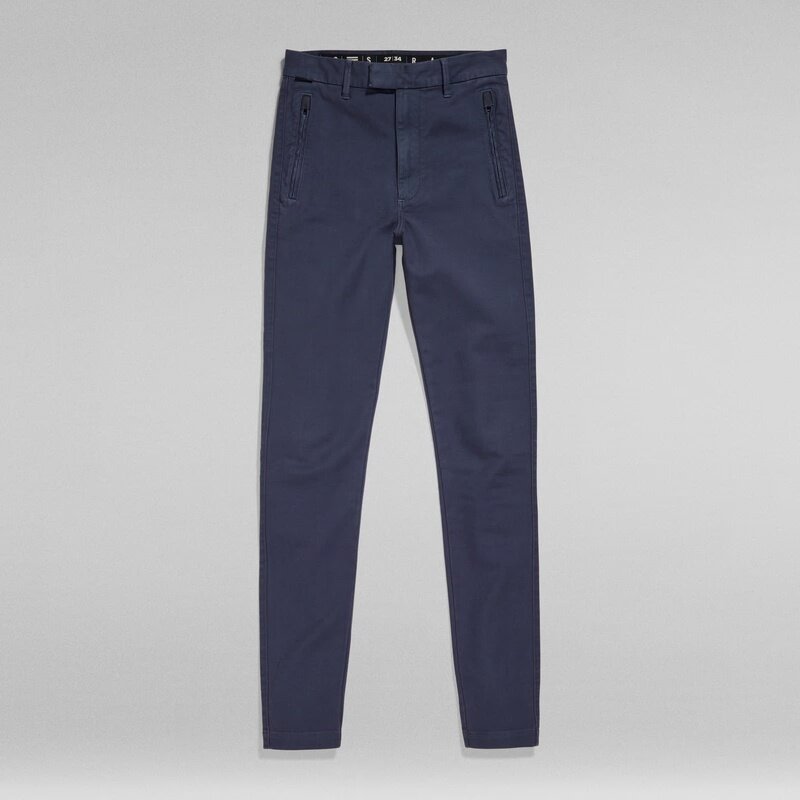 Concealed zippers at the waist pockets offer a woven tape detail at the top. These chino Weld pants are designed in a skinny fit with a high waist. Double welt back pockets show a button closure at one side. The hidden hook and bar closure ensure a clean finished waistband.