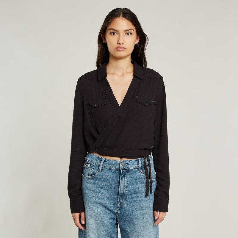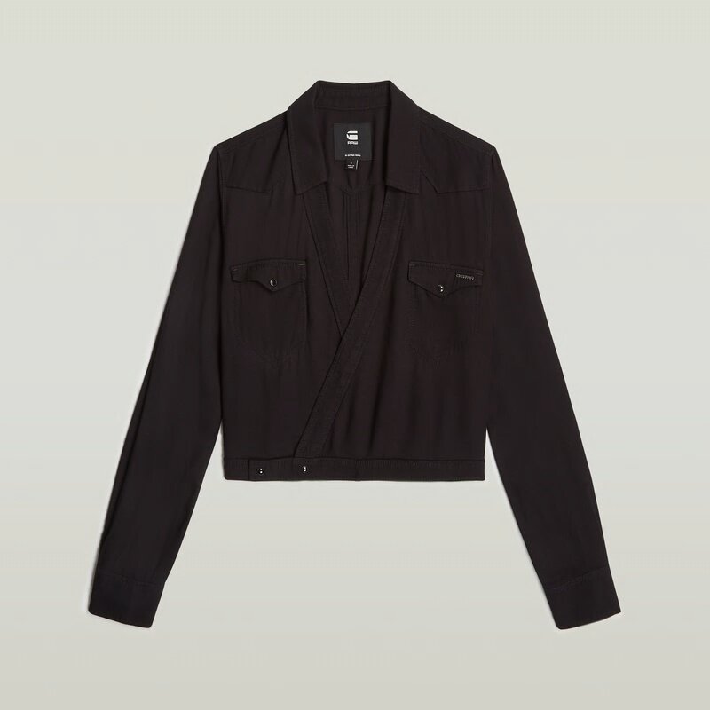 Wrap shirt Tacoma is cut in a shorter length and offers a V-neck with a collar. Flap pockets are added to the chest. The shoulder panels and vertical back seam add detail.