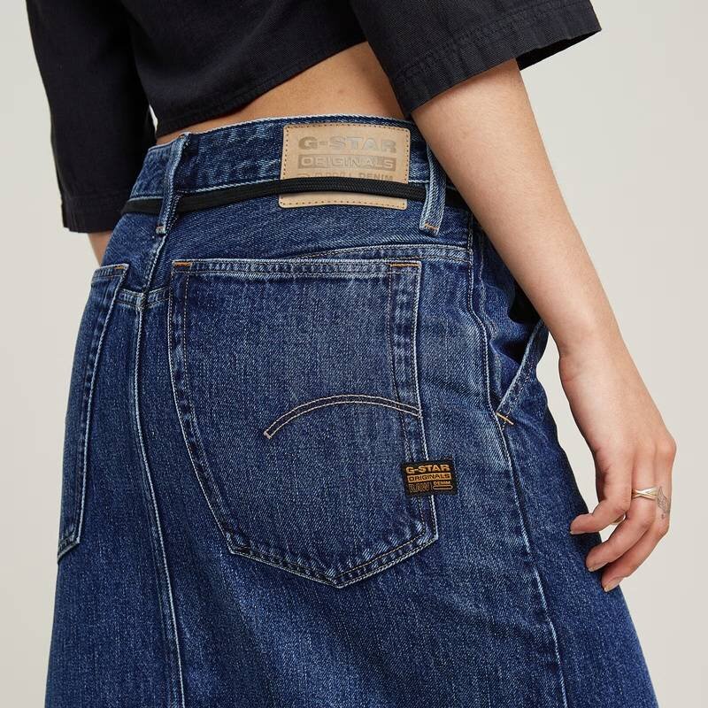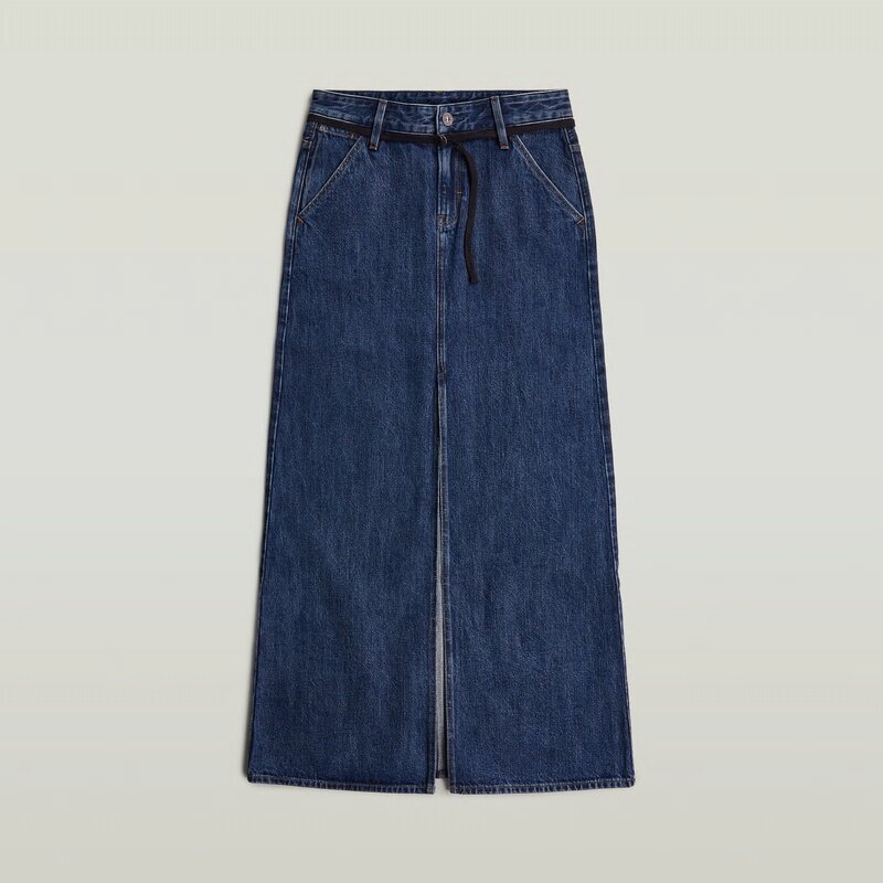 Maxi skirt Baggy offers a low waist and a loose fit. A fine woven tape creates a belt detail. This relaxed fitting denim skirt shows a deep slit at the front. Oversized back pockets add character.