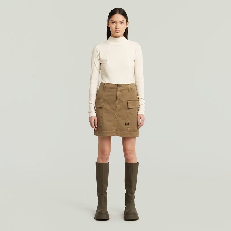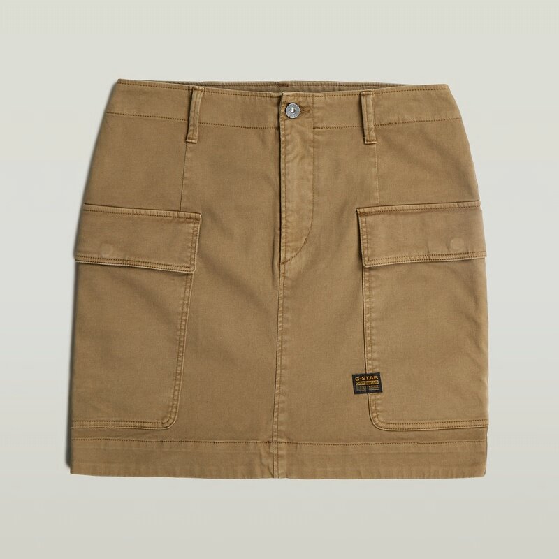 The Cargo Short Skirt features a mid-waist design with a zip and button closure, complemented by practical pockets.