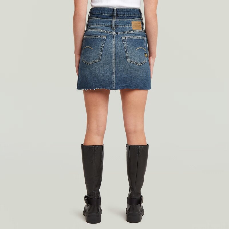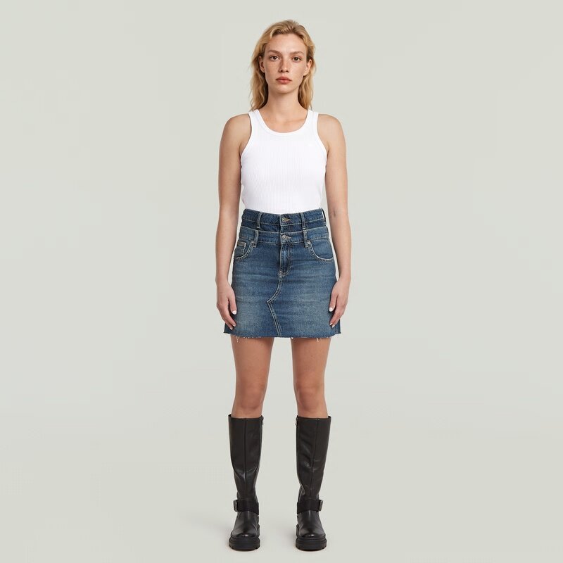 The Carter mini skirt sits mid waist and features a button fly closure. The double waistband design creates a unique stacked effect.