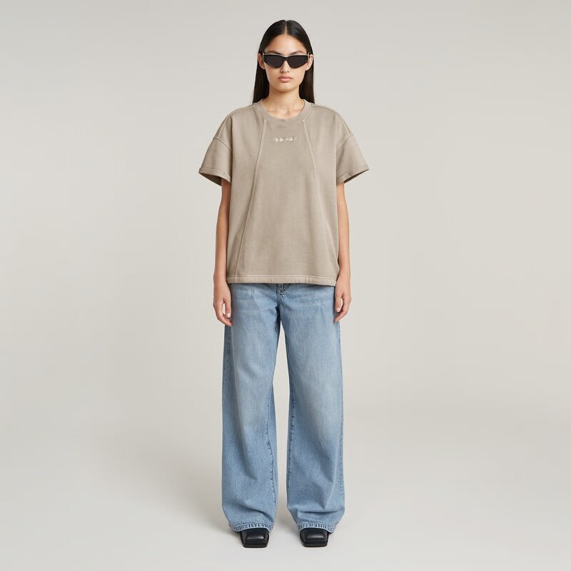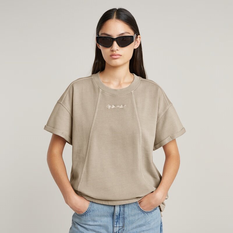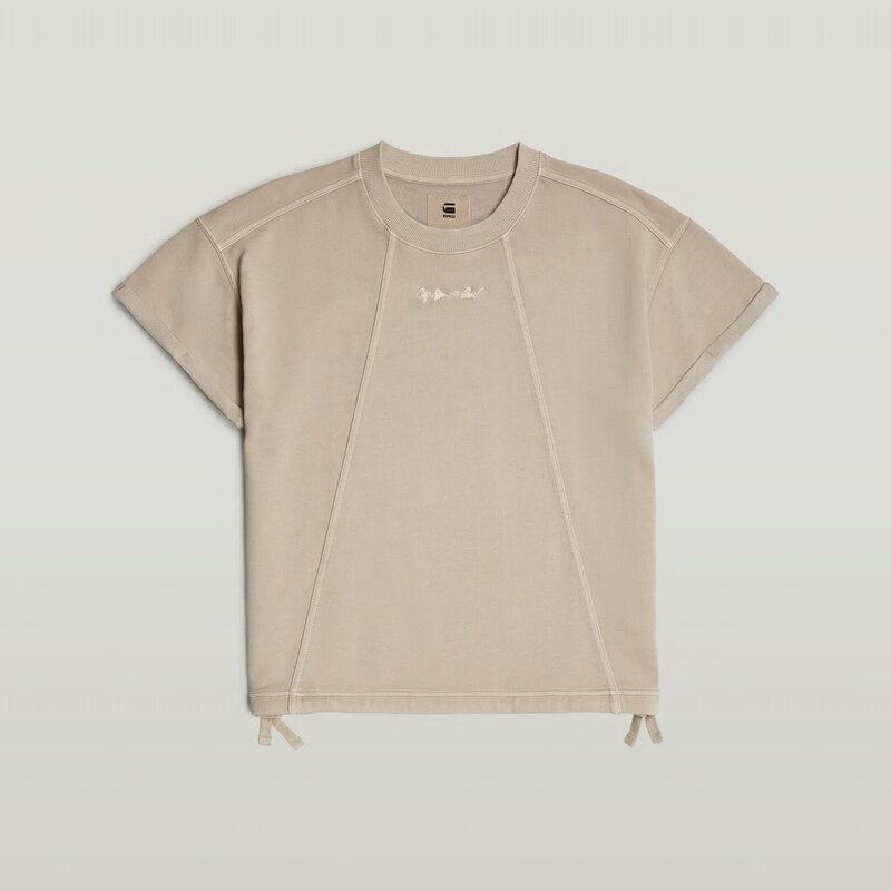 Short sleeved sweater Seam Detail is cut in a loose fit and offers diagonal seams at the front. A drawcord in the hem allows for a tighter waist and more volume. The rolled-up sleeves add detail.