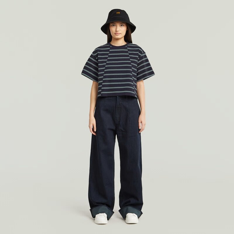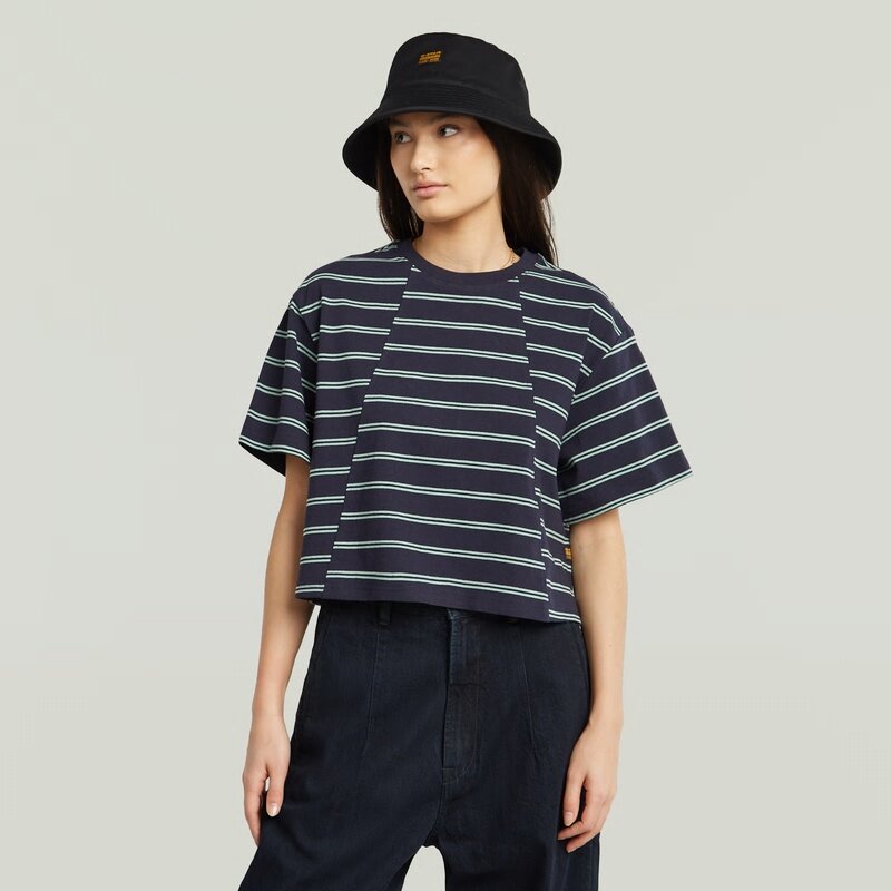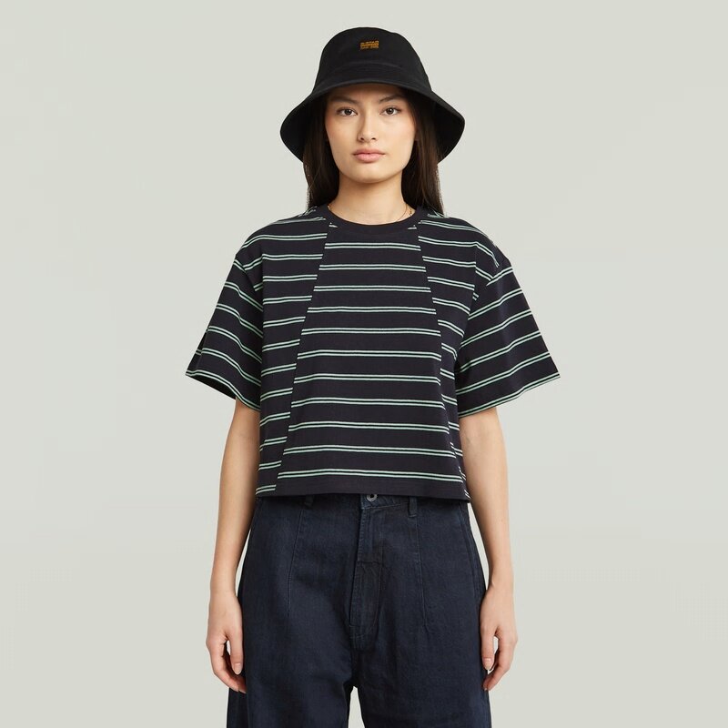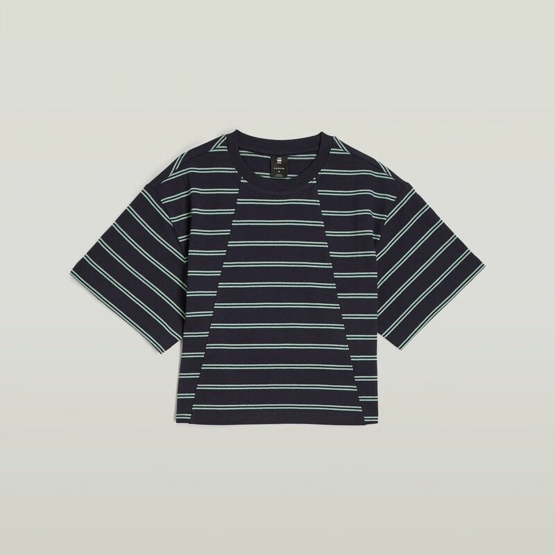 The A-Line Stripe Boxy T-Shirt features a relaxed fit with a graphic stripe design, offering a casual and comfortable style.